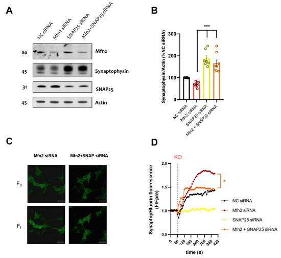 We used a double knock-down approach to decrease Mfn2 and SNAP25 protein levels in the same cells. We reported the successful knock-down of SNAP25 alone (SNAP25 siRNA) and in combination with Mfn2 (Mfn2+SNAP25 siRNA), accounting for a reduction of SNAP25 levels of around 50% compared to NC siRNA conditions. Using immunoblotting we assessed the vesicle marker synaptophysin, as in the previous section. SNAP25 KD alone or in combination with Mfn2 KD led to a significant upregulation of synaptophysin levels compared to Mfn2 siRNA cells (see Figure 3A,B (p ≤ 0.01)), indicative of vesicle accumulation.