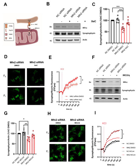 To further assess the role of Ca2+ in modulating the exocytosis at the ER-mitochondria interface, we pharmacologically blocked Ca2+ entry through the MCU channel in the inner mitochondrial membrane. In a recent high throughput screen, MCU-i4 has been identified as an inhibitor of MICU1, a crucial component of the MCU complex that regulates channel gating, thus blocking Ca2+ entry into the matrix [57]. Similarly, to the experiments carried out with XeC, synaptophysin levels were measured in NC and Mfn2 siRNA cells treated with MCUi4 or DMSO. Like XeC, MCUi4 treatment alone had no effect on synaptophysin protein levels in the NC siRNA samples; while in Mfn2 KD cells, MCUi4 reversed the significant downregulation of synaptophysin reported in DMSO-treated Mfn2 siRNA cells (Figure 4F,G). Exocytosis evaluation further revealed that no changes in SypHy fluorescence were observed in NC siRNA cells treated with MCUi4 compared to DMSO treated NC siRNA cells. However, following KCl treatment, MCUi4 reduced the SypHy fluorescence ratio and slope of the curve (p ≤ 0.05 and p ≤ 0.001 respectively, Figure 4H,I, Figure S3D–F).