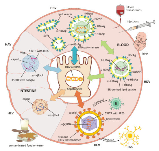 Structure and ways of transmission of the hepatitis viruses A, B, C, D and E. While HAV and HEV are enterically transmitted by contaminated water or food and mainly cause acute hepatitis, HBV, HDV and HCV are blood-borne infections, which are responsible for chronic disease development in many cases. (HAV) HAV has a single-stranded RNA genome encoding a polyprotein, which is translated 5′cap-independently under the control of an IRES. The 5′UTR is linked to VPg and the 3′UTR ends with a poly(A) tail. The virion exists as a non-enveloped form in the stool (as depicted here) and as eHAV in the blood of infected patients (not shown). (HBV) HBV exclusively infects liver cells and is packed in a lipoprotein envelope containing small, medium and large surface proteins. The core protein builds up a nucleocapsid containing partially double-stranded DNA (rcDNA) with an associated polymerase. In addition to viral particles, pre-core protein (HBeAg), and high amounts of non-infectious SVPs containing only envelope proteins are secreted. Inside the nucleus of infected hepatocytes, the HBV genome is converted to cccDNA, which remains stable in form of a mini chromosome or episome serving as a genomic template for viral mRNA synthesis. (HDV) HDV is known to infect hepatocytes and has a css(-)RNA that codes for only one viral protein in two forms, a small (S-HDAg) and a large (L-HDAg) viral antigen. By base-pairing, the genomic RNA has a rod-like structure and is associated with S-HDAg and L-HDAg, forming an RNP. In order to form virus particles, HBsAg envelope proteins of the HBV virus are embedded in an ER-derived lipid vesicle. (HCV) HCV is an enveloped virus with a single positive-stranded RNA encoding a polyprotein, which is subsequently cleaved into 3 structural and 7 functional proteins. It primarily infects hepatocytes, but HCV-RNA has been detected in peripheral blood cells, cerebrospinal fluid and in the brain of patients with chronic infection. Two envelope glycoproteins, E1 and E2, form trimeric heterodimers in the host-derived lipid envelope and are the main target of neutralizing antibodies during immune response. (HEV) HEV is mainly transmitted by contaminated food or water and replicates in the liver. In the stool and in the liver, it occurs as envelope-free virus with an ss(+)RNA encoding an enzymatic polyprotein and structural proteins. In the blood of infected patients, it can be detected as eHEV virion (not shown). Abbreviations (in alphabetical order): B = B lymphocyte; cccDNA = covalently closed circular DNA; CNS = central nervous system; css(-)RNA = circular single negative-stranded RNA; eHAV = quasi-enveloped hepatitis A virus; eHEV = quasi-enveloped hepatitis E virus; ER = endoplasmic reticulum; HBcAg = hepatitis B core antigen (capsid protein); HbeAg = hepatitis B e antigen (precore protein); IRES = internal ribosomal entry site; l-HbsAg = large hepatitis B surface antigen; L-HDAg = long hepatitis D antigen; m-HbsAg= medium hepatitis B surface antigen; rcDNA = relaxed circular DNA; RNP = ribonucleoprotein; s-HbsAg = small hepatitis B surface antigen; S-HDAg = short hepatitis D antigen; ss(+) RNA = single positive-stranded RNA; SVPs = subviral particles; UTR = untranslated region; VPg = viral protein genome-linked.