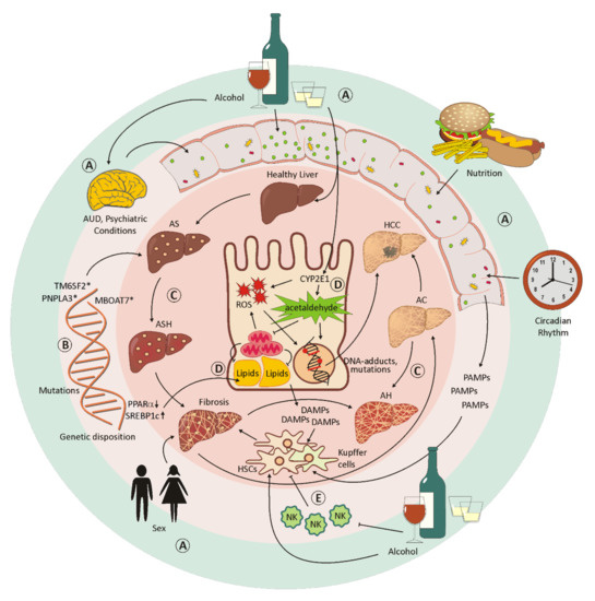 In most cases, chronic alcohol abuse leads to severe physical and psychological damage. Alcohol-induced liver disease (ALD) is associated with considerable mortality and includes abnormalities such as fatty liver (steatosis), steatohepatitis (ASH), alcoholic hepatitis (AH), progressive fibrosis and, finally, alcoholic cirrhosis (AC) and/or hepatocellular carcinoma (HCC) [42,43]. Chronic alcoholism also contributes to cancers of the oropharynx, the esophagus, the intestine and the female breast, and to cardiovascular diseases and neuropsychiatric disorders such as epilepsy and depressive disorders [44,45]. Although alcoholism is considered a preventable cause of disease, around 3.3 million deaths are caused by alcohol-related organ damage, traffic accidents and violence worldwide [46]. A strong component of this condition is alcohol-use disorder (AUD). This behavioral condition is characterized by a tolerance to the psychotropic effects and ignorance of the harmful effects of alcohol consumption. It is usually associated with neural impairment, accidents, injuries and psychological disorders such as anxiety and depression [44,46]. Alcohol abuse not only has far-reaching effects on the lives of patients, it also affects their social environment and the health system. Whereas the spectrum of alcoholic liver diseases ranges from asymptomatic liver steatosis, fibrosis and cirrhosis to alcoholic hepatitis, the severity and progression of the disease depends on the extent of alcohol consumption, the genetic disposition and the gender of the patient [45,46]. Women seem to be more sensitive to increased alcohol consumption and develop ALD within a shorter time, and with lower doses of alcohol, compared to men [46]. However, since only about 15–20% of chronic heavy drinkers develop alcohol-associated liver diseases, a complex interplay between environmental and genetic risk factors is assumed [47]. Coexisting aspects, such as poor diet, inactive lifestyle, depression, and changes in the circadian rhythm, are considerable influencing factors [45,47,48]. In addition, pre-existing conditions such as obesity, the intake of certain drugs or vitamins, or illnesses such as hepatitis B and C virus infections, hereditary hemachromatosis, α1-antitrypsin deficiency, and non-alcoholic steatohepatitis (NASH) may contribute to a more severe progression of ALD [45]. An overview of the extrinsic and intrinsic factors that affect the course of liver disease is schematically depicted in Figure 2A–E.
