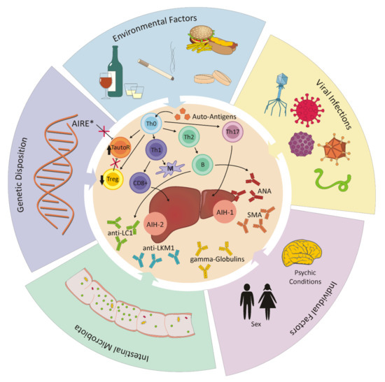 As external triggers, virus infections can promote the development of AIH. Often, the infection dates back years, which makes a retrospective identification of the pathogen impossible. Molecular mimicry by the cross-reactions of viral epitopes and certain liver antigens is conceivable. Pathogens such as measles virus, cytomegalovirus or Epstein–Barr virus could act as a disease triggers; however, the involvement of hepatitis viruses is most likely [86]. The defects in immune response could be induced by the same pathogenic trigger, which is characteristic for the host or the disease [84].