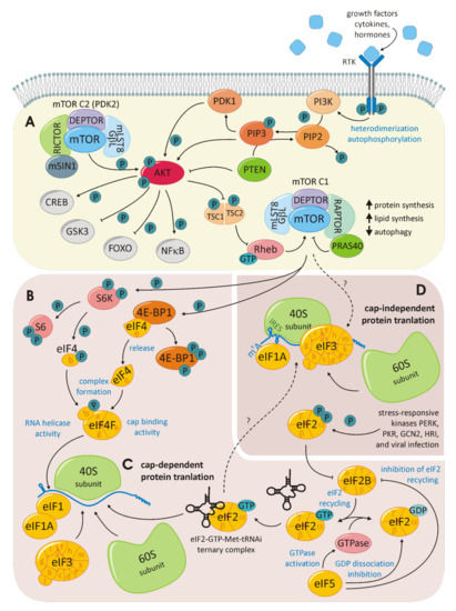 The mTOR anabolic pathway is highly conserved. mTOR itself is a 289-kDa, phosphatidylinositol-3-kinase (PI3K) family-related serine/threonine protein kinase that interacts with other proteins to establish two distinct complexes: mTORC1 and mTORC2 (for a schematic overview, see Figure 5A). Both complexes contain mLST8/GβL and DEPTOR. Raptor and PRAS40 are specific to mTORC1, while the proteins Rictor and mSIN1 are specific to mTORC2. While mTORC1 is associated with cell-growth control, the activity of mTORC2 controls cell survival and proliferation. A broad range of upstream signals, including growth factors, hormones and cytokines, provoke the activation of PI3K that phosphorylates and thereby activates AKT, which is the upstream activator of mTOR. For example, the insulin-like growth factor would bind the extracellular region of a receptor tyrosine kinase (RTK) in this manner, thereby activating the ligand-induced receptor dimerization, leading to kinase activation. RTKs will autophosphorylate the dimerization partner at the C-terminal tail, recruiting a variety of downstream signaling proteins containing Scr homology-2 (SH2) or phosphotyrosine-binding domains (PTBs). The PI3K contains two RTK interacting SH2 domains in its adaptor subunit. Consequently, PI3K catalyzes the generation of phosphatidylinositol-3,4,5-triphosphate from phosphatidylinositiol-4,5-bisphosphate. This reaction is competed by the tumor-suppressor phosphatase and tensin homolog (PTEN). Attracted by the newly formed phosphatidylinositol-3,4,5-triphosphate AKT is recruited to the plasma membrane, where it is phosphorylated by PDK1 and, in a second step, by mTORC2. AKT is a potent kinase phosphorylating, among others, tuberous sclerosis complex2 (TSC2) and Rheb within the mTORC1 complex. AKT may also activate mTORC1 in a TSC-independent manner. Activated mTOR phosphorylates further downstream targets involved in a lipid and nucleotide synthesis, energetic homeostasis, ribosome biogenesis, nucleotide metabolism and cell-cycle progression through mTORC1 and via mTORC2 cell proliferation and survival, cytoskeletal remodeling and cell migration [106,107]. The mTOR-dependent regulation of translation initiation is primarily executed by the phosphorylation of eukaryotic translation initiation factor 4E-binding protein 1 (4E-BP1) (as depicted in Figure 5B). Unphosphorylated 4E-BP1 is stably associated to eIF4E, thus inhibiting the eIF4F cap-binding complex formation required for the initiation of cap-dependent translation. Therefore, the phosphorylation of 4E-BP1 releases eIF4E, which joins eIF4A and eIF4G to form the eIF4F complex. mTOR interacts with another eIF complex: eIF3. eIF3 is a 13-subunit complex that is assembled in a modular manner. Different modules or eIF3 proteins interact with the ribosome, while other eIFs and translational enhancers are required to fine-tune translation initiation. As a scaffold of regulation, eIF3 also interacts with mTOR [108]. This interaction, in addition to the regulation of 4E-BPs, enables mTOR to influence cap-independent translation initiation.