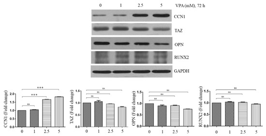 To determine the mechanism of action of VPA in inducing osteogenesis of the TMSCs, some osteogenic inducing factors were assessed. The TMSCs were exposed at 1, 2.5 and 5 mM of VPA for 72 h, and the protein level of CCN1 [5], TAZ [22], OPN [23] and RUNX2 [24] was analyzed by using Western blotting. VPA slightly decreased the protein level of TAZ, RUNX2 and OPN in a dose-dependent manner, but its effect was not significant (Figure 4). However, VPA significantly increased CCN1, a known angiogenic and osteogenic factor, at 2.5 and 5 mM VPA exposure (p < 0.001), suggesting that VPA could induce osteogenesis by inducing the CCN1 expression.