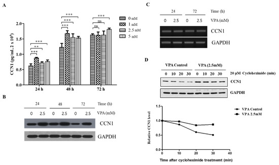 VPA induces the protein level of CCN1 by increasing the stability of CCN1 protein rather than increasing the transcription of CCN1 mRNA. The TMSCs were seeded at 2.0 × 105 cells/mL of density, followed by VPA exposure at 0, 1, 2.5 and 5 mM for 24, 48 and 72 h. (A) The media concentration of CCN1 was measured by using CCN1 ELISA kits. The values represent mean ± SD of the CCN1 concentration (pg/mL) from three independent experimental trials. Statistically significant is denoted as ** p < 0.01 or *** p < 0.001, which were determined by one-way ANOVA followed by Tukey’s multiple comparisons. (B) The protein lysates of the TMSCs exposed to either 0 or 2.5 mM of VPA for 24, 48 and 72 h were collected and was used for Western blotting to measure the level of CCN1 protein, which was presented as a blot. GAPDH was also presented as a reference protein. (C) The total RNA of the TMSCs exposed to either 0 or 2.5 mM of VPA for 24, 48 and 72 h were obtained from TriZol method, and PCR was performed to assess the expression of CCN1. (D) The TMSCs were treated with 20 μM of cycloheximide after 24 h of either 0 or 2.5 mM of VPA exposure. The protein lysates were collected at 0, 10, 20 and 30 min after the cycloheximide treatment to evaluate the time-dependent degradation of CCN1. The protein level of CCN1 was quantified by using Image Lab software and normalized by the protein level of GAPDH. The results are representative of three independent experimental trials, and the values represent mean ± SD of the fold changes relative to the control at 0 min of time points for each respective 0 and 2.5 mM of VPA treatment.