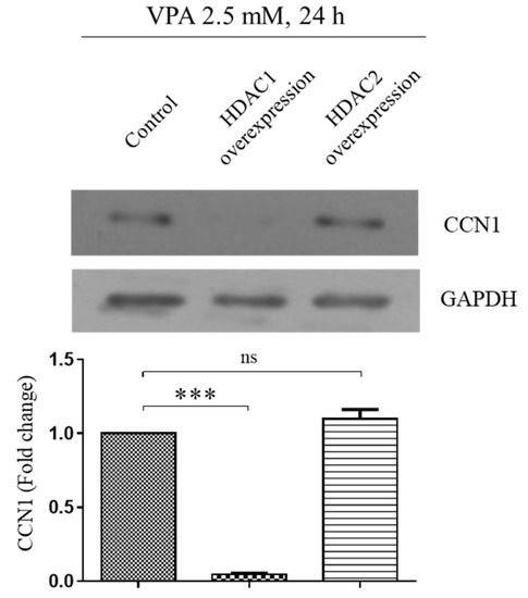 Overexpression of HDAC1 downregulates the CCN1 induced by VPA. We transfected 1.0 × 106 of TMSCs with either 2 μg of HDAC1/pOTB7 or 2 μg of HDAC2/pME18S-FL3 by electroporation, using an Amaxa Human MSC Nucleofector® kit with Amaxa Scientific NucleofectorTM II device, according to the manufacturer’s protocol. The control cells were exposed to the same condition as the transfected group without the inclusion of the plasmid in this study. After the transfection, the cells were treated with 2.5 mM of VPA for 24 h, and the protein level of CCN1 was assessed by using Western blot. The protein level of CCN1 from the blot was quantified by using Image Lab software and normalized by the level of GAPDH. The values represent mean ± SD of the fold change of the CCN1 protein level relative to the TMSCs transfected with the control siRNA from three independent experimental trials. Statistically significant is denoted as *** p < 0.001, as determined by Student’s t-test.