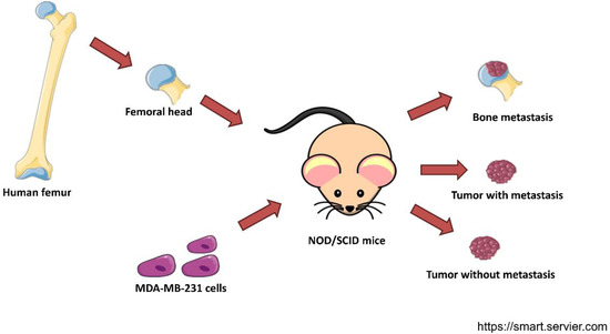 Experimental design of the dataset GSE137842. Trabecular bone fragments from femurs of postmenopausal women were implanted in female NOD/SCID mice. Then, MDA-MB-231 cells were injected into their mammary ducts. cDNA of cancer cells from the primary tumor that developed metastasis, a tumor that did not develop metastasis, and a secondary tumor in the human bone xenograft were subjected to a whole-genome Affymetrix array [19]. This figure was created with templates from https://smart.servier.com/ (accessed on 4 January 2022), a free medical art source licensed under a Creative Common Attribution 3.0 Generic License.