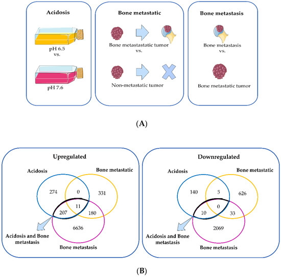 (A) Schematic representation of the comparisons made between the transcriptome of MDA-MB-231 in different conditions: long-term culture in pH 6.5 relative to long-term culture in pH 7.6 (acidosis); bone metastatic primary tumor relative to non-metastatic primary tumor (bone metastatic); bone metastasis relative to bone metastatic primary tumor (bone metastasis). (B) Venn diagram of the upregulated and downregulated genes of the three comparisons: “acidosis”, “bone metastatic”, and “bone metastasis”. The Figure 2A was created with templates from https://smart.servier.com/ (accessed on 4 January 2022), a free medical art source licensed under a Creative Common Attribution 3.0 Generic License.