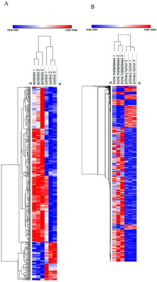 Heatmap of the transcriptome of MDA-MB-231 in chronic acidosis (A) and in MDA-MB-231 from bone metastasis in a mouse xenograft model (B). Rows (differentially expressed genes) and columns (samples) were clustered hierarchically by Euclidian distance. Red and blue correspond to maximum and minimum values relative to row average.