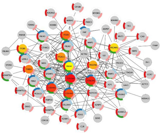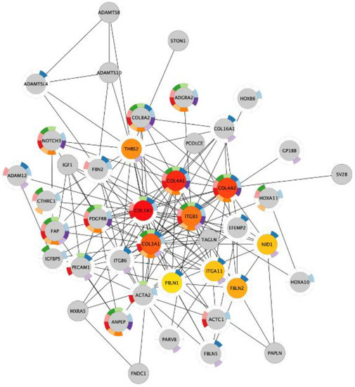 Next, we investigated if the shared upregulated genes in acidosis and bone metastasis belonged to the most important changes in acidosis. The overlap “Acidosis and Bone metastasis” was compared to “Acidosis”. The top five enrichment terms in “Acidosis” (Table 5) were also among the six more enriched terms in “Acidosis and Bone metastasis” (Table 6). These findings indicate that the adaptation of cancer cells to the bone microenvironment would favor fitness in acidic conditions by remodeling the extracellular matrix and enhancing angiogenesis. The bone marrow is more vulnerable to oxygen fluctuations [33], so angiogenesis could be a strategy to survive in this microenvironment. Additionally, the top seven nodes of the “Acidosis” network (Figure 4) were present among the top ten nodes of “Acidosis and Bone metastasis” (Figure 5): COL1A1, COL3A1, COL4A1, COL4A2, ITGB3, THBS2, and ITGA11. In other words, the main genes involved in adaptation to acidosis are included in the transcriptomic changes in MDA-MB-231 bone metastasis.