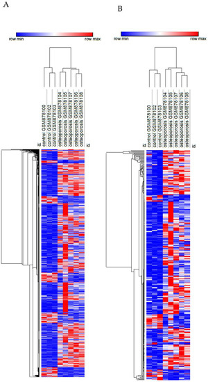 Heatmap of the transcriptome (A) and transcriptome-based secretome (B) of mesenchymal stem cells from femoral heads of female patients with or without osteoporosis. Rows (differentially expressed genes) and columns (samples) were clustered hierarchically by Euclidian distance. Red and blue correspond to maximum and minimum values relative to row average.
