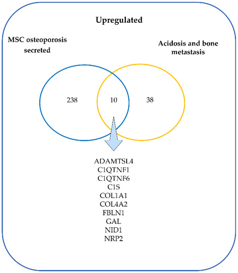 Finally, we identified which upregulated genes in acidosis and bone metastasis with predicted secretion were also upregulated in the osteoporosis secretome. The two groups of samples—osteoporosis and control—were distinguishable by DEGs and by DEGs of the transcriptome-based secretome (Figure 6). Overall, there were more upregulated than downregulated genes. Ten overlapping genes were found: ADAMTSL4, C1QTNF1, C1QTNF6, C1S, COL1A1, COL4A2, FBLN1, GAL, NID1, and NRP2 (Figure 7). Interestingly, all of the ten most enriched terms in acidosis and bone metastasis were also enriched in the secretome of mesenchymal stem cells (MSC) in osteoporosis (Table 8).