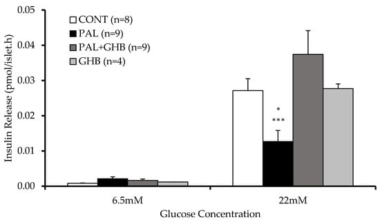 Figure 1 illustrates the protective effect of 5 mM GHB on insulin secretion in this in vitro model. Palmitate significantly decreased GSIS as expected. Despite exposure to palmitate, islets concomitantly treated with GHB maintained normal levels of insulin secretion. GHB alone did not affect insulin secretion.