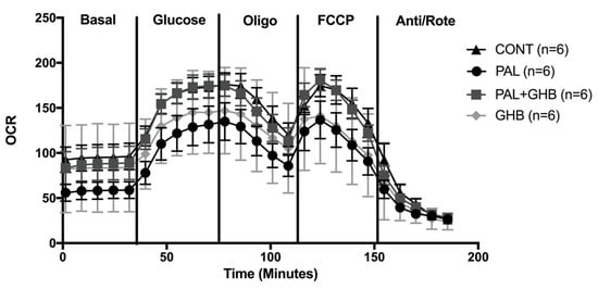 Effects of palmitate and gamma-hydroxybutyric acid (GHB) on oxygen consumption rate in mouse islets. Measurement of oxygen consumption rate (OCR) with Seahorse XF cell Mito Stress Test (Seahorse Bioscience, Billerica, MA, USA). Islets were treated for 48 hrs with (1) control media (black triangle), (2) Palmitate (0.4 mM) (black circle), (3) Palmitate (0.4 mM) and GHB (5 mM) (dark-gray square), and (4) GHB (5 mM) alone (light-gray diamond). Palmitate treatment tended to reduce OCR while GHB seemed to have a protective effect. Data are means ± SE. One-way parametric ANOVA for repeated measures followed by Tukey’s test was performed to compare differences between treatments.
