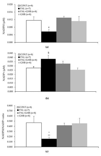 Figure 4a reveals that palmitate tended to reduce islet NADPH levels while co-treatment of palmitate with GHB significantly increased NADPH levels compared to islets treated only with palmitate (p < 0.01). Figure 4b reveals that palmitate tended to increase islet NADP+ levels. Lastly, Figure 4c shows that palmitate reduced the ratio of NADPH/NADP+, which was prevented by co-treatment with GHB (p < 0.05 vs. ALL, p < 0.01 vs. PAL + GHB and GHB).