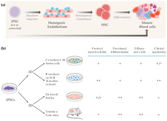 Hematopoietic differentiation from iPSCs. (a) Steps to generate blood cells from iPSCs. The HSC stage occurs during definitive hematopoiesis; (b) Strategies to generate blood cells from iPSCs. Symbols indicates absence (−), low (+/−), moderate (+), or strong (++) compliance with the highlighted features (protocol reproducibility, functional differentiation, efficacy, yield and clinical application).