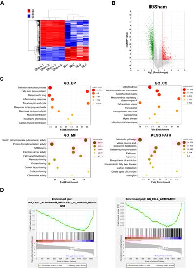 To identify differentially expressed transcriptomes between sham and IR rat hearts, we performed total RNA-Seq using HiSeq 2500. The results showed that a total of 6486 genes were differentially expressed with a >2.5-fold change, with p < 0.05. A hierarchical cluster was used to show the different RNA profiles, and a volcano plot was used to provide an overview of the differentially expressed RNAs between the two groups (Figure 1A,B). Gene Ontology (GO) enrichment analysis was used to show the functional classifications for differentially expressed genes, and the Kyoto Encyclopedia of Genes and Genomes (KEGG) pathway enrichment identified the relevant signaling pathways of these genes. The top 10 most enriched GO terms in the biological process (BP), cellular component (CC), and molecular function (MF) categories and the KEGG pathways are shown in Figure 1C. In addition, we conducted gene set enrichment analysis (GSEA) with the differentially expressed genes to identify the gene set hallmarks. The results showed that there was strong enrichment in IR rat hearts for the “Cell activation involved in immune response” and “Cell activation” terms (Figure 1D and Figure S1).