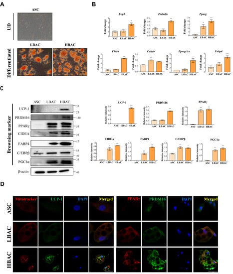 Beige adipocyte differentiation of rat adipose-derived stem cells. (A) Representative microscopic images of adipocytes stained with ORO (magnification, ×100, Scale bar = 100 μm). (B) Assessment of the mRNA expression of browning markers by qPCR. (C) Validation of differentially regulated browning markers by immunoblot analysis. The intensity of each band was quantified with ImageJ software. The data are shown as the mean ± standard error of the mean (n = 3). * p < 0.05, ** p < 0.01, and *** p < 0.001 vs. ASC. (D) Assessment of the expression of browning markers by immunofluorescence staining. Scale bar = 50 μm. UD means “undifferentiated”.