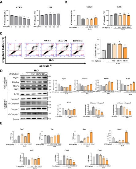Regulation of antioxidant and apoptotic factors by beige adipocyte secretions. (A) Cell viability and cytotoxicity in H9c2 cells under H2O2 stimulation. (B) Cell viability and cytotoxicity in H9c2 cells under H2O2 stimulation with CM. H9c2 cells were treated with 300 μM H2O2 for 3 h and then exposed to CM for 1 h. The data are shown as the mean ± standard error of the mean (n = 5). (C) Annexin V/PI staining as detected by flow cytometry. (D,E) Differential expression of antioxidant/apoptotic factors in H9c2 cells by ASC, LBAC, or HBAC-derived CM treatment. The factors were determined using western blot analysis (D) and qPCR (E). The data are shown as the mean ± standard error of the mean (n = 3). * p < 0.05 and ** p < 0.01 vs. non-treated (A) or H2O2-treated group (B–E). cl means ”cleaved form”.