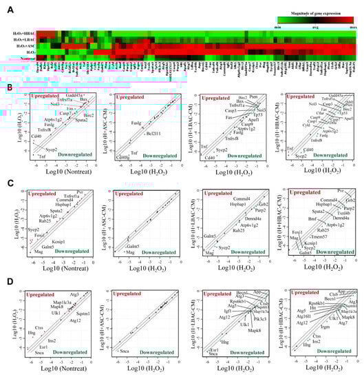 To investigate the involvement of cell death signals in oxidative stress induced in cardiomyocytes, we evaluated the expression of multiple cell death signal-associated genes in CM-treated H9c2 cells compared with H2O2-stimulated H9c2 cells using a Cell Death PathFinder RT2 Profiler PCR array. This array profiles the expression of 84 key genes representative of cell death signals involved in apoptosis, necroptosis, and autophagy. The heatmap showed that most of the cell death-related genes were upregulated with H2O2 stimulation in H9c2 cells (Figure 4A). Surprisingly, multiple cell death signal-related genes were significantly downregulated after HBAC treatment in H2O2-stimulated H9c2 cells. The relative expression levels of each gene in two samples (nontreated vs. H2O2-stimulated sample, H2O2-stimulated sample vs. CM-treated sample) were plotted against each other in the scatter plot, which revealed the up- and downregulated genes in the experimental samples (Figure 4B–D). Oxidative stress in cardiomyocytes influenced the expression of cell death genes involved mostly in apoptosis, necroptosis, and autophagy signals. The expression of apoptotic factors such as Cd40, Gadd45a, and Sycp2 was most strongly upregulated by H2O2 stimulation in H9c2 cells. In addition, 12 out of 27 proapoptotic genes were upregulated with more than 2-fold gene expression changes after H2O2 stimulation, while the expression of the three genes Bcl2l11, Cd40g, and Tnf was unaffected (Figure 4B). Additionally, upregulation of 12 out of 22 necrosis-related genes was detected after H2O2 stimulation in H9c2 cells, while the expression of necrotic genes was significantly downregulated in HBAC-CM-treated cells (Figure 4C). Moreover, 11 of 31 autophagy-associated genes were upregulated in H2O2-stimulated H9c2 cells, while the expressed genes were downregulated after HBAC-CM treatment (Figure 4D).