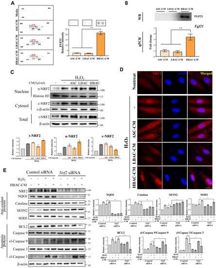 Our present study found enhanced NRF2 expression levels in HBAC-CM-treated cardiomyocytes under oxidative stress than in LBAC-CM-treated cardiomyocytes. In addition, the expression of antioxidant and antiapoptotic genes was upregulated by highly secreted FGF21 after HBAC-CM treatment compared to LBAC-CM treatment in H9c2 cardiomyocytes via NRF2 activation.