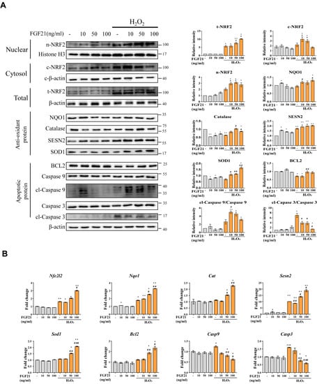 Effect of FGF21 treatment on H2O2-induced oxidative stress and apoptosis in H9c2 cells. Assessment of the differential expressed antioxidant/apoptotic factors by western blot (A) and qPCR (B). The data are shown as the mean ± standard error of the mean (n = 3). * p < 0.05 and ** p < 0.01 vs. non-treated group; # p < 0.05, ## p < 0.01 and ### p < 0.001 vs. H2O2-treated group. cl means “cleaved form”.