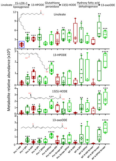 - Shureiqi, I.; Wonjo, K.J.; Poore, J.A.; Reddy, R.G.; Moussalli, M.J.; Spindler, S.A.; Greenson, J.K.; Normolle, D.; Hasan, A.A.; Lawrence, T.S.; et al. Decreased 13–S–hydroxyoctadecadienoic acid levels and 15–lipoxygenase–1 expression in human colon cancers. Carcinogenesis 1999, 20, 1985–1995. [Google Scholar] [CrossRef] [Green Version]