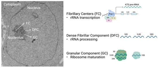 The nucleolus contains three distinct compartments responsible for pre-rRNA transcription, rRNA processing, and ribosome subunit assembly. The nucleoli are located within the nucleus (shown in the electron microscopy photo to the left) and are comprised of three sub-compartments: the fibrillary centers (FC), the dense fibrillar component (DFC), and the granular component (GC). The transcription of rDNA occurs in the FC upon the binding of selectivity factor 1 (SL1), which leads to the activation of the cofactors upstream binding factor (UBF) and TIF-1A, initiating RNAPolI to transcribe rDNA into 47S pre-rRNA. The 47S pre-rRNA is processed into 18S, 5.8S, and 28S rRNA in the DFC. Ribosome maturation proceeds in the GC, where additional RPs are wrapped around rRNAs. Figure created with Biorender.com (accessed on 31 January 2022).