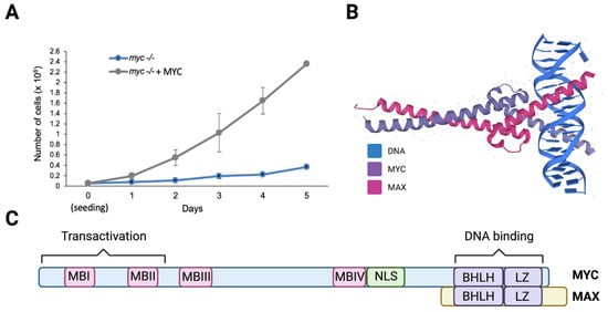 MYC heterodimerizes with MAX and increases cell proliferation. (A) Proliferation curve of HO15.19 myc-/- rat fibroblasts expressing empty vector or MYC. Cells were seeded and counted for 5 days. (B) The structure of the basic helix-loop-helix and leucine zipper (bHLH-LZ) domains of the heterodimer MYC-MAX and DNA (PDBe-KD), https://www.ebi.ac.uk/pdbe/pdbe-kb/proteins/P01106/interactions, (accessed on 28 November 2021). (C) Schematic representation of the MYC protein sequence with MYC Boxes (MBI, MBII, MBIII, MBIV), nuclear localization signal (NLS), and bHLHLZip domain on the C-terminus where DNA and MAX interacts. Figure created using Biorender.com (accessed on 28 January 2022).