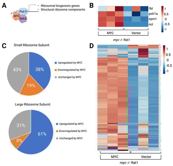 Ribosomal biogenesis and structural ribosome components are upregulated in MYC-expressing cells. (A). Schematic of the interaction of MYC and MAX with the transcription machinery that drives the expression of regulatory and structural genes necessary for ribosome biogenesis. (B). Heatmap of myc-/- expressing empty vector or reconstituted with MYC. Data are extracted from published RNAseq [] for nucleolar genes. (C). Pie chart showing that MYC increased the transcription of 38% of the structural components of the small ribosome subunit and 61% of the large subunit. Data were obtained by comparing the expression of structural ribosome genes in myc-/- expressing empty vector or reconstituted with MYC using a cutoff of Log2 fold change of  and with adjusted p-value of . (D). Heatmap of myc-/- expressing empty vector or reconstituted by MYC. Data was extracted from published RNAseq [] for structural RPs. Heatmaps were generated by MetaboAnalyst 5.0 (https://www.metaboanalyst.ca/, accessed on 10 December 2021). Figure created using Biorender.com, (accessed on 31 January 2022).