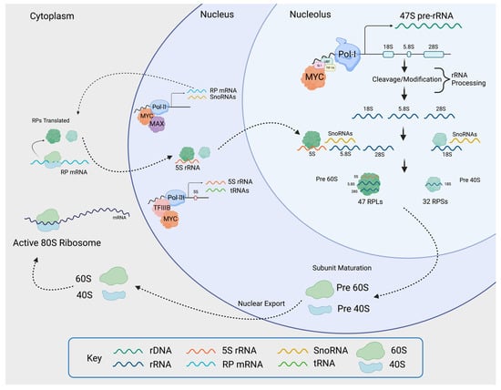 MYC induces ribosomal biogenesis processes. MYC heterodimerizes with MAX and promotes RNAPolI activity by binding to the rDNA promoter, as well as by activating the expression of selectivity factor 1 (SL1), which binds other RNAPolI cofactors such as upstream binding factor (UBF) and TIF-1A. The rDNA is transcribed into 47S pre-rRNA in the nucleolus. The pre-rRNA is processed and cleaved into 18S, 5.8S, and 28S rRNA. MYC-MAX simultaneously enhances RNAPolII activity by binding to RNAPolII-regulated promoters, as well as RNAPolIII activity by inducing the expression of the RNAPolIII cofactor TFIIIB. This yields RNAPolII-driven small RPs (RPS) mRNA, large RPs (RPL) mRNA, RNAPolIII-driven snoRNAs, and 5S rRNA. The mRNAs are transported into the cytoplasm where mature ribosomes translate them into small and large RPs. Once translated, small RPs are imported into the nucleolus. Large RPs are first imported into the nucleus, where they interact with 5S rRNA, and then to the nucleolus. In the nucleolus, the pre-rRNAs are modified and processed with the help of snoRNAs. As they are maturing, the rRNA wrap around the RPs, creating the pre-40 and pre-60 subunits which are exported to the cytoplasm for the final maturation step. Once maturation is complete in the cytoplasm, the active 80S ribosomes are formed. The small 40S subunit comprises 18S rRNA and 32 small RPs, and the large 60S subunit comprises 5S, 5.8S, and 28S rRNA and 47 large RPs. Figure created using Biorender.com (accessed on 31 January 2022).