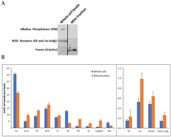 (A) Mitochondria were isolated from U118MG cells according to Kappler et al. The mitochondrial isolate and an identical amount (20 μg) of the whole cell lysate were subjected to SDS-PAGE and immunoblotting using antibodies against the PM marker alkaline phosphatase, the endoplasmic reticulum marker KDEL sequence and the mitochondrial marker Tom20. Representative results from 3 different experiments are shown. (B) Lipidomics of whole cell input and isolated mitochondrial fraction. The enrichment of CL (p < 3.54 × 10−9) and PG (p < 2.68 × 10−6) can be observed in the mitochondrial fraction, which is also depleted of several PM markers, such as PC (p < 2.17 × 10−8) and PS (p < 2.91 × 10−12). The levels of the other lipids were also different between whole cells and isolated mitochondria: PC-O (p < 1.47 × 10−7), PE (p < 5.45 × 10−7), PE-P (p < 0.003), PI (p < 4.00 × 10−5), LysoGPL (p < 0.0004), SM (p < 0.001), PA (p < 0.01), Cer (p < 1.51 × 10−6), HexCer (p < 0.0004), AcCar_long (p < 0.101). Shown are mean ± SEM, n = 6. Differences determined by Student’s t-tests. PC and PC-O, phosphatidylcholine (diacyl and alkyl-acyl); PE and PE-P, phosphatidylethanolamine (diacyl and alkenyl-acyl); PI, phosphatidylinositol; PS, phosphatidylserine; PG, phosphatidylglycerol; CL, cardiolipin; LysoGPL, Lyso glycerophospholipids; SM, sphingomyelin; PA, phosphatidic acid; Cer, ceramide; HexCer, hexosyl ceramide; AcCar_long, long-chain acylcarnitine.
