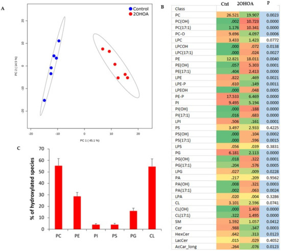 2OHOA treatment resulted in a very clear separation of non-treated vs. treated mitochondrial lipidomes as assessed by principal component analysis (Figure 2A). The main effect of 2OHOA on mitochondrial membranes was its incorporation into glycerophospholipids (Figure 2B and Table S1). C2-hydroxylated and odd-chain species indicate the esterification of 2OHOA in its original form [16] and after conversion to 17:1 fatty acid, respectively. This was especially pronounced in mitochondrial phosphatidylcholine and cardiolipin, which incorporated 2OHOA and 17:1 fatty acyl moieties at similar proportions. As a result, the ratio of hydroxylated lipid species accounted for 50%–60% of the corresponding non-2OHOA-generated species following 2OHOA treatment (Figure 2C). Another significant effect of 2OHOA on mitochondrial membranes is a decrease in the level of acylcarnitines (Figure 2B), which might inhibit mitochondrial β-oxidation for which acylcarnitines are rate-limiting.