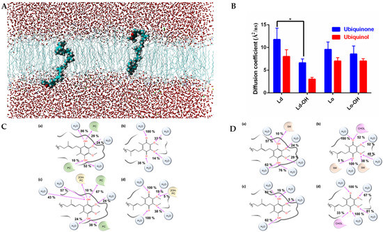(A) Snapshot of the ubiquinol embedded in a POPC/2OH-POPC fully solvated membrane. (B) Diffusion coefficients of ubiquinone and ubiquinol in model Lo and Ld membranes. The (-OH) suffix indicates a partial hydroxylation of the lipid chain. Two-way ANOVA (n = 3) show significant (p < 0.0001) differences between the row (Ld, Ld-OH, Lo, Lo-OH) and column (ubiquinol v ubiquinone) factors. *, Student’s t-test shows significant difference (p < 0.027) between hydroxylated and non-hysdroxylated lipids in Ld membrane. (C) Graphical representation of the hydrogen bonds occurring in the last 10 ns of simulation between the ubiquinol (a,c) or ubiquinone (b,d) and the water/membrane system. In (a,b), we simulated the ubiquinol and ubiquinone embedded in a pure POPC membrane (the lipids were indicated in green as PC). In (c,d), we simulated the ubiquinol and ubiquinone embedded in a membrane model POPC/2OH-POPC (50%–50%). The hydroxylated POPC was indicated as 2OH-PC and colored in yellow. The pink arrow indicates whether the oxygen atom is an acceptor or donor of hydrogen bonds. Interactions with a frequency lower than 5% were not shown. (D) Same as in (C), but in (a,b) we simulated the ubiquinol and ubiquinone embedded in a membrane model SM/CHOL (60%–40%). The SM lipids were indicated as SM and colored in light orange. The cholesterol was indicated as CHOL and colored in pink. In (c,d) we simulated the ubiquinol and ubiquinone embedded in a membrane model SM/2OH-SM/CHOL (30%–30%–40%). The pink arrow indicates whether the oxygen atom is an acceptor or donor of hydrogen bonds. Interactions with a frequency lower than 5% were not shown. The hydroxylated form of SM shows no relevant interactions with CoQ.