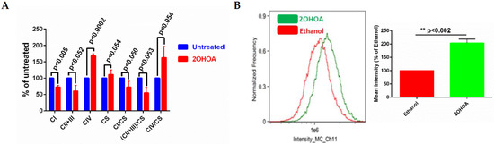 We have previously demonstrated that 2OHOA is an OxPhos uncoupler [21]. To better understand the bioenergetic effects of 2OHOA, we also tested its effects on respiratory complex activity using spectrophotometric methods [34,35]. As our results (Figure 4A) show, 2OHOA treatment increased complex IV activity, but, surprisingly, also down modulated the activity of complexes I, II, and III, consistent with the reduction of the diffusion rate of CoQ as an electron carrier from complexes I and III and II and III. 2OHOA also led to an overall increase in mitochondrial mass, as shown by the increase in citrate synthase activity, as a marker of intact mitochondria (Figure 4A), and by staining with the potential-independent mitochondrial marker Mitotracker and flow cytometry (Figure 4B).