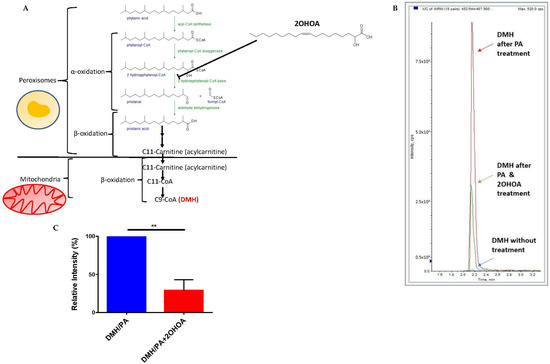 We also tested whether 2OHOA can inhibit mitochondrial β oxidation of lipids by a possible competitive inhibition of upstream peroxisomal α oxidation (2OHOA can undergo α oxidation and is thus converted to C17:1 (PVE, patent #PCT/ES2021/070068)). To that end, we quantified, by mass spectrometry, the extent of β oxidation of the branched fatty acids phytanic acid. Phytanic acid first undergoes α-oxidation in the peroxisome and is eventually converted to pristanic acid, which is converted to the 11 carbon intermediate 4,8-dimethylnonanoyl-CoA (C11-CoA), which is carnitine-esterified and translocated to the mitochondria for complete β-oxidation [36] (Figure 5A). 2OHOA is structurally similar to one of the fatty acids in these cascade, 2-hydroxyphytanoyl-CoA, which is also hydroxylated at the α carbon. Therefore, we hypothesized that 2OHOA might competitively inhibit fatty acid β-oxidation at this upstream peroxisomal step, leading to a restriction in the availability of the β-oxidation substrate C11-CoA. To test this hypothesis, we fed U118MG cells with phytanic acid as a precursor to the mitochondrial β oxidation biomarker 2,6-dimethylheptanoyl CoA (DMH, C9-CoA). We tested the rate of formation of this biomarker with and without pre-treatment with 2OHOA. Our results (Figure 5B,C) demonstrate a clear inhibition of thus measured β oxidation by 2OHOA.