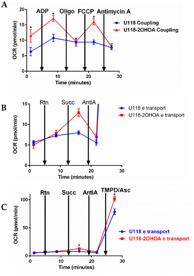 Mitochondria (2 μg/well) were isolated from untreated and 2OHOA-treated (200 μM, 48 h) U118MG cells. Respiratory activities of each complex were analyzed using Agilent’s Seahorse Mito Stress kit according to Agilent’s application note https://www.agilent.com/cs/library/applications/5991-7145EN.pdf, accessed on 4 February 2022. In coupling experiments (A), using rotenone and succinate as a substrate, OCR was determined following the addition of indicated reagents. An increase in OCR following ADP and FCCP supplementation indicates a unique uncoupling effect of 2OHOA. (B) (blowup of (C)) Electron flow experiments showing OCR following the supplementation of the indicated inhibitors initially using pyruvate-malate as a substrate and 4 μM FCCP to disengage electron flow from the proton motive force. Electron flow was not affected by the complex I inhibitor rotenone (Rtn). Still, it was significantly increased in 2OHOA treated cells upon supplementation of the complex II substrate succinate and decreased by supplementation of the complex III inhibitor antimycin A. Complex IV activity, measured following the supplementation of its substrate TMPD/Ascorbate, was significantly increased by 2OHOA. OCR, Oxygen consumption rate; Rtn, Rotenone; Succ, Succinate; Asc, Ascorbate. Shown are means and S.D. of n = 3 experiments. *, significant difference between treated and untreated (p < 0.05), determined by Student’s t-test.