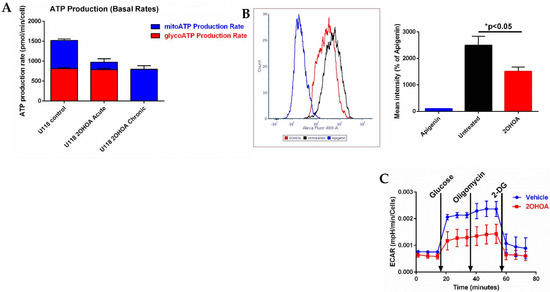 (A) Glycolytic (red) and mitochondrial (blue) ATP production determined by Agilent’s Seahorse machine and real-time ATP rate assay kit. U118MG cells were treated, or not (control), with 200 μM 2OHOA for 48 h (chronic), or for 20 min on assay (acute). Readings were normalized to cell numbers as determined by Crystal Violet staining. Shown are mean and SEM values based on n = 3 repeats. Chronic treatment with 2OHOA led to complete depletion of glycolytic ATP production, while acute treatment significantly reduced respiratory ATP production (p < 0.002) leaving glycolytic ATP production intact (p < 0.92). These differences were inferred statistically by one-way ANOVA with Sidak’s post hoc correction. (B) Glycolysis estimated by NBDG (2-Deoxy-2-[(7-nitro-2,1,3-benzoxadiazol-4-yl)amino]-d-glucose) uptake into U118MG cells, as quantified by flow cytometry. U118MG cells were treated with 200 μM 2OHOA for 48 h and then assayed for NBDG uptake as per the manufacturer instructions. Apigenin is a Glut 1 inhibitor and serves as a control for inhibition of NBDG uptake. Right panel shows quantification based on n = 3 experiments. (C) Glycolysis estimated by the Seahorse XF Glyco Stress kit based on n = 6 replicates. U118MG cells (~40,000 per well as determined by crystal violet staining) were treated, or not (vehicle), with 200 μM 2OHOA for 48 h and their glycolysis was determined by extracellular acidification rate (ECAR) using the Seahorse XF Glyco Stress kit. Basal and maximal glycolysis were respectively estimated by supplementations of 10 mM glucose and 1 μM oligomycin, while non-glycolytic ECAR was estimated by blocking glycolysis with 2-deoxyglucose (2-DG).