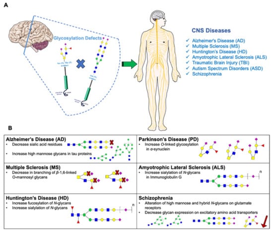 In the last decade, researchers worked extensively to unveil the relationships between glycoproteins and neurodegenerative diseases, including Alzheimer’s disease (AD), Parkinson’s disease (PD), Huntington disease (HD), Multiple Sclerosis (MS), and Amyotrophic Lateral Sclerosis (ALS). These relationships are depicted in Figure 2 and Table 3 found just below.