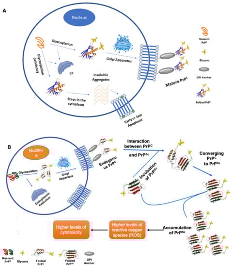 - Winklhofer, K.F.; Heller, U.; Reintjes, A.; Tatzelt, J. Inhibition of complex glycosylation increases the formation of PrPsc. Traffic 2003, 4, 313–322. [Google Scholar] [CrossRef] [PubMed]