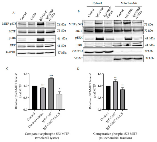 Mast cell activation by IgE-DNP leads to an increase in nuclear MITF phosphorylation on Serine 73 [10], and this phosphorylation is time dependent. MITF phosphorylation is short term and happens immediately after allergic trigger, since longer exposure time may lead to ubiquitin-mediated degradation, as was observed in previous studies in melanoma [12,23]. Subcellular fractionation of mast cells into the cytosol and mitochondria reveals that MITF is Serine 73 phosphorylated after IgE-DNP stimulus. Localization of ERK1/2 into the mitochondria indicates its active role in phosphorylating mitochondrial substrates such as the BCL2 family proteins to influence metabolism, cell survival and mitophagy [24], by which ERK 1/2 activated by phosphorylation after allergic activation maintains the energy homeostasis. To understand whether phosphorylation of MITF at Serine 73 is due to mitochondrial ERK1/2, a well-known ERK1/2 inhibitor U0126 was added during IgE-DNP stimulation of RBL cells and BMMCs. A significant decrease in pS73-MITF levels with unchanged MITF levels indicates active ERK is responsible for this phosphorylation.