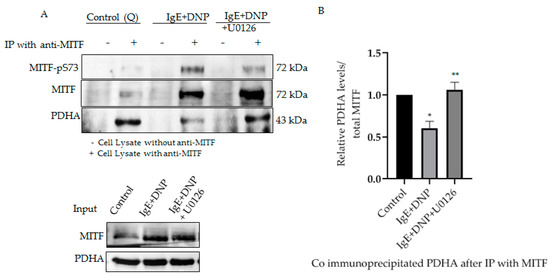 We previously reported the association of mitochondrial MITF with PDH, whereby the association-dissociation status was dependent on immunological activation of the mast cell. PDH is known to be dephosphorylated after allergic stimulation, causing its dissociation from MITF, freeing it to play an active role in mitochondria [1]. To determine whether phosphorylated MITF interacts with PDH after immunological activation and in the presence of ERK1/2 inhibitor, immunoprecipitation experiments were performed. MITF was immunoprecipitated with MITF-specific antibody, and its interaction with PDH was determined by means of Western blot analysis with anti-PDHA.