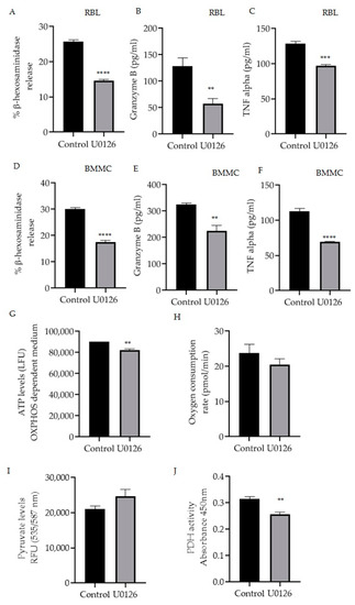 Mitochondrial MITF’s phosphorylation of Serine 73 in activated RBL mast cells was decreased by U0126 inhibitor treatment (Figure 2B). Therefore, the effect of this inhibitor on mast cell function was assessed by measuring β-hexosaminidase release, TNF-α and granzyme B levels in RBL cells (Figure 4A–C) and BMMC (Figure 4D–F). Figure 4G–J shows the effect of inhibitor treatment on ATP levels, oxygen consumption rate (OCR) in OXPHOS-dependent medium along with pyruvate and PDH activity levels.
