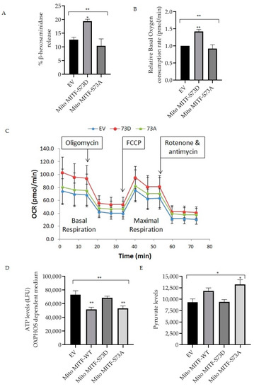 In order to determine the effect of mutant plasmids on mitochondrial function, transfected RBL cells were cultured for 24 h in a glucose-free medium supplemented with dialyzed serum as an energy source. 48 h after transfection, oxygen consumption rate was assessed using the XF96 extracellular flux analyser. As shown in Figure 5B, mitochondrial MITF-S73D significantly increased the basal mitochondrial respiration (n = 3, p = 0.0099). In contrast, mitochondrial MITF-S73A decreased the oxygen levels by 8.5% when compared with EV and by 36% when compared to mitochondrial MITF-S73D, where the data is statistically significant (n = 3, p = 0.0052). ATP levels were measured with the ATPlite Luminescence Assay System in glucose-free medium 48 h after transfection (Figure 5D). To further evaluate the effect of these mutants on PDH activity, pyruvate levels were also checked using a pyruvate ELISA kit. As shown in Figure 5E, mitochondrial MITF-S73A had significantly higher pyruvate levels (n = 3, p < 0.0192) which is in correlation with the significant decrease in ATP levels (n = 4, p < 0.0088). Both ATP and pyruvate levels data were statistically significant in comparison with the mean of EV (n = 4, p < 0.0038; n = 3, p < 0.0191, respectively).