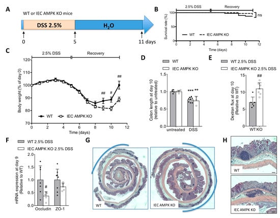 IBD is a major public health issue associated with high morbidity and mortality, and studying the underlying mechanisms is important for the development of new therapeutic strategies []. The loss of IEB integrity and inefficient mucosal repair are important factors triggering IBD onset [,]. It has been reported that IBD is clearly associated with IEB dysfunction (leaky gut) in patients, and barrier abnormalities include, among others, intestinal epithelial cell–cell junction alterations []. The 36–50 kDa DSS is a water-soluble polysaccharide widely used to induce colitis in mice, with features resembling human ulcerative colitis []. The DSS-induced colitis model is very popular due to its rapidity, simplicity and controllability. Acute, chronic and relapsing models of intestinal inflammation can be achieved by modifying the concentration of DSS and the frequency of administration. The mechanism by which it induces colitis is unclear; however, this model does not require the activation of T and B cells, thus excluding adaptative immunity study, but favoring the study of the contribution of the innate immune system to the development of intestinal inflammation. In addition, the DSS colitogen likely induces epithelial apoptosis and consequent damages, and is, therefore, a useful model to study epithelial-dependent remodeling and inflammation in colitis []. In the present study, we demonstrate that IEC AMPK is an important player in the modulation of the sensitivity to DSS-induced colitis and regulation of mucosal repair after injury, suggesting the potential for targeting AMPK in the treatment of leaky gut disorders.