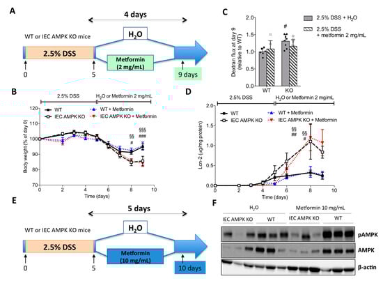 Effect of metformin treatment during the recovery phase on the recovery from DSS-induced colitis in WT and IEC AMPK KO mice. (A) Experimental timeline for mice treated with 2.5% DSS in drinking water for five consecutive days, followed by four days of metformin (2 mg/mL) in drinking water or regular water. (B) Changes in body weight (n = 6–9 mice/group). (C) In vivo intestinal epithelial permeability on day 9. Dextran flux was determined by measuring the amount of 4 kDa TRITC-dextran in the plasma 4 h after gavage. Data are presented as mean dextran flux fold change relative to respective control mice (n = 6–9 mice/group). (D) Lipocalin-2 (Lcn-2) levels in feces from WT and IEC AMPK KO mice during the course of DSS-induced colitis and treatment with metformin (2 mg/mL) in drinking water (n = 6–9 mice/group). (E) Experimental timeline for mice treated with 2.5% DSS in drinking water for five consecutive days, followed by five days of metformin (10 mg/mL) in drinking water or regular water. (F) Levels of total AMPKα and AMPKα-Thr172 phosphorylation in full-thickness colon biopsies from WT and IEC AMPK KO mice on metformin (10 mg/mL) in drinking water or regular water (n = 3 mice/group). (G) Quantification of AMPKα-Thr172 phosphorylation in Western blot from three replicates. (H) Changes in body weight (n = 6–9 mice/group). (I) In vivo intestinal epithelial permeability on day 10. Dextran flux was determined by measuring the amount of 4 kDa TRITC-dextran in the plasma 4 h after gavage. Data are presented as mean dextran flux fold change relative to respective control mice (n = 6–9 mice/group). (J) Representative images of H&E-stained colon sections on day 10 from IEC AMPK KO and WT DSS-treated mice administrated H2O or 10 mg/mL metformin during the recovery phase. Pictures are representative of 3–4 mice/group. Scale bars = 50 µm. (K) Histological damage score and quantification of percentage of ulceration related to total colon length in IEC AMPK KO and WT mice upon DSS-induced epithelial damage and metformin (10 mg/mL) treatment (n = 3–4 mice/group). Data are expressed as means ± SD. Statistical analysis was performed by one-way ANOVA or two-way ANOVA with Bonferroni post hoc test; * p < 0.05 and ** p < 0.01 indicate a significant difference relative to the untreated condition; # p < 0.05, ## p < 0.01 and ### p < 0.001 indicate a significant difference between genotype and §§ p < 0.01 and §§§ p < 0.001 indicate a significant difference between metformin-treated mice.