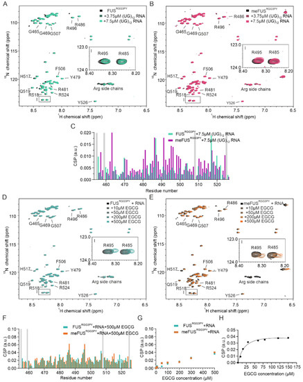We and others have previously demonstrated that RNA can directly interact with RG/RGG regions of several RNA-binding proteins (RBPs), including FUS, CIRBP, and hnRNP family proteins [23,24,25,36,37]. This prompted us to determine whether (i) arginine methylation of the FUSRGG3PY is compatible with RNA binding and whether (ii) RNA binding affects EGCG binding of methylated or unmethylated FUSRGG3PY, respectively. We first tested the effect of FUSRGG3PY arginine methylation on RNA binding using NMR spectroscopy. Stepwise addition of (UG)12 RNA to solutions of either 15N-labeled methylated or unmethylated FUSRGG3PY caused CSPs of several 1H-15N (me)FUSRGG3PY cross-peaks (Figure 3A–C). In addition to CSPs, line broadening was observed for unmethylated FUS. The CSPs of meFUSRGG3-PY binding to RNA at 4:1 molar ratio are higher than the CSPs of FUSRGG3PY (Figure 3C). These results indicated that RNA is binding to both unmethylated and methylated RGG3-PY regions of FUS but is stronger with the methylation of arginines. The line broadening observed for unmethylated FUS is likely a result of its propensity to phase separate in the presence of RNA, as previously published [23].