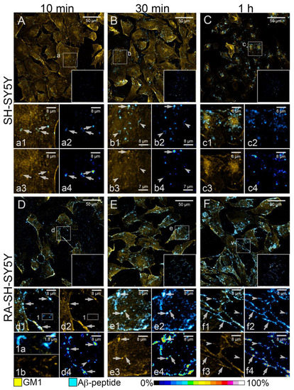 GM1 and Aβ-42 amyloid species in SH-SY5Y and RA-SH-SY5Y cells. (A–F) Representative images of SH-SY5Y (A–C) and RA-SH-SY5Y (D–F) cells stained to reveal GM1 (Yellow) after 10 min (A,D), 30 min (B,E) and 1 h (C–F) of incubation with Aβ-Fib (Cyan); square areas in lower right corner insets show efficiency of FRET interactions (corresponding full-size images are shown in Supplementary Figure S1). Insets (a–e,v) show details of the areas selected in images (A–F): images of merged channels (a1–f1), Aβ-42 immunofluorescence (a2–f2), GM1 staining (a3–c3,e3,f3) and FRET efficiency (a4–f4) are shown. Arrows in (a–f) indicate sites of high FRET efficiency between amyloid species and gangliosides. Arrowheads in (a–c) indicate sites of low FRET efficiency. Arrowheads in (d–f) indicate sites of amyloid binding to cell fragments on glass coverslips. Inset 1 shows details of the area selected in (d); merged fluorescent signals (1a) and GM1 staining alone (1b) are shown.