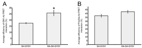 Comparative analysis of FRET interactions. Efficiency of FRET interactions between the fluorochrome Alexa Fluor 488 on GM1 (A) and PolySia (B) with Alexa Fluor 568 on Aβ-42 species adhering to the plasma membrane of SH-SY5Y and RA-SH-SY5Y cells after 1 h of seeding. Values are expressed as average ± SE; n = 3. T-test * p < 0.05 vs. SH-SY5Y.