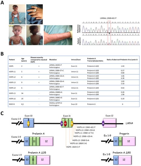 Patients included in this study showed variable disease severity compared to classical HGPS but presented with similar phenotypes, including growth retardation, hair loss, prominent forehead, prominent superficial veins, thin skin, loss of subcutaneous fat, and lipodystrophy (Figure 1A). HGPS-like patients were previously reported to present distinct aberrant splicing patterns of prelamin A pre-mRNAs due to mutations located around the exon 11 donor splice site (Figure 1B,C) []. Briefly, patient HGPS-L1 [] carrying the LMNA heterozygous c.1968+2T>C mutation, was referred to our center at the age of five years. She was diagnosed with the disease when she was 10 months old, presenting with a typical HGPS clinical phenotype, including frontal bossing, prominent veins on her scalp and forehead, sparse hair, micrognathism with delayed dentition, growth retardation (since birth, her length varied from the 2nd to the 10th centiles for age; the weight was stably < 3rd centile for age), subcutaneous lipoatrophy, dry skin with pigmentary changes on the neck and trunk, acroosteolyses with the onychodystrophy of hands and feet; laboratory findings have evidenced recurrent thrombocytosis (480–535 k/µL; normal values: 140–450 k/µL), elevated transaminases, glucose, calcium, and phosphorus, as already observed in classical HGPS patients []. Patient HGPS-L2 [], carrying the heterozygous LMNA c.1968+1G>A mutation, showed a very similar progeroid laminopathy, though evolving more severely. She was diagnosed at nine months of age and already showed contractions of her ankles, knees, and wrist. She subsequently developed arthritis on several articulations. Her feeding was poor, and she had frequent constipation episodes. She had a bilateral hip dislocation, and, at the age of three years, she suffered from a femur fracture. At age six, she suffered from tachycardia together with sudden right arm paresis; cerebral CT scan/MRI showed multiple micro-infarcts, including recent and old ones, while echocardiography showed left ventricular thickening. After partial recovery from stroke, she suffered from a chest infection together with painful nail infections. Patients HGPS-L3 (LMNA heterozygous c.1968+5G>A), HGPS-L6 (LMNA heterozygous c.1868C>G), and HGPS-L5 (LMNA heterozygous c.1968G>A) were previously reported by Barthelemy et al. []. Patient HGPS-L4 (LMNA heterozygous c.1968+6C>T) is first reported in this work. She was referred to our clinics at age 4 years and presented with sparse hair and eyebrows, a small chin, a thin nose, prominent nipples, dyspigmentation with hyper/hypo-pigmented areas, and sclerodermatous changes on her chest. The MAD-B patient was first referred to us at age 6.5 years. She presented with growth retardation, exophtalmia, low-set ears, retro-micrognathism (mandibular hypoplasia), sparse hair, and thin, dry skin with hypopigmented lesions, especially on the trunk. Subcutaneous lipoatrophy gave her a muscular pseudo-hypertrophic appearance. Molecular genetic diagnosis allowed the identification of a new homozygous mutation in the ZMPSTE24/FACE1 gene’s exon 10: c.1274T>C, p.(Leu425Pro), confirming the B-type mandibuloacral dysplasia phenotype in the patient [,].