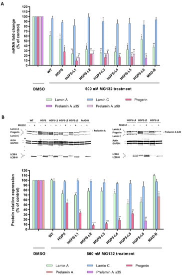 Several strategies have been developed to correct some of these abnormalities, either in cell cultures, in animal models, or in progeria patients, targeting progerin farnesylation, clearance, abnormal splicing, or downstream effects. MG132 has been shown to enhance progerin clearance in human cell cultures and in the skeletal muscle of LmnaG609G/G609G progeria mice model, thus correcting some biological parameters. We, therefore, hypothesized that MG132 could also have a beneficial impact on HGSP-like and MAD-B cells since they share the same pathophysiological mechanism based on the abnormal splicing of prelamin A pre-mRNA. To this end, we evaluated the treatment’s efficacy of MG132 in reducing the production of all prelamin A isoforms, including aberrantly accumulated prelamin A, either truncated (HGPS-like) or wild type (MAD-B). Here, we show a significant decrease of each aberrant transcript’s production (prelamin A ∆35, ∆50, and ∆90) as well as the corresponding abnormal proteins. Interestingly, MG132 not only induces the synthesis blockade of the aberrant prelamin A isoforms and the clearance of the corresponding proteins already expressed but also results in the improvement of several biological parameters, including cellular senescence, proliferation, altered protein expression, DNA damage and repair, as well as inflammatory cytokine expression. Given that the accumulation of aberrant prelamin A isoforms and, consequently, the alteration of WT lamin A functions cause several side effects, it is not surprising that the clearance of these aberrant isoforms improves the phenotype of the patients’ cells.